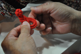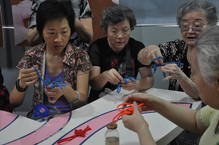 盘扣是中国传统的文化元素,具有功能性和装饰性的作用。盘扣随着服装的发展不断地发生变化,至清初得到广泛应用,其取材内容丰富,形态变化多端,富含寓意,强调对称美,在服装中起到了画龙点睛的装饰作用。活动中老师指导大家从“葡萄扣”入手,领略中国服饰文化传统之美。参观者手拿编绳巧妙地左缠右绕,编结出一个个精美的盘扣。