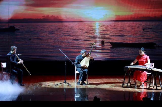 演出节目精彩纷呈。独具创意的《捣练图》复原,将古画中表现十二女子劳动生活的场景搬到了舞台上,各个人物的再现,让古画变得栩栩如生。由艺术教育中心教师、学生民乐团指导教师周纪来以及民乐团外聘教师王锡澄、刘一的古筝、琵琶、箫三重奏《夕阳箫鼓》,服装学院杨子田老师担纲古琴领奏的《梅花三弄》民乐合奏等节目连番上演,精湛的演奏技巧,出神入化的意境,博得现场观众阵阵掌声。