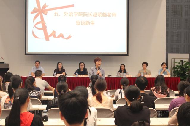 赵晓临院长代表学院师生员工表达了对2017级全体新同学的欢迎,她结合自身经历和人生阅历,讲述了自己在求知道路上逐步完善自我、全面发展的过程。她指出,语言学习是了解不同国家文化,开拓国际视野增长个人智慧的有效途径,更是以学养识,培养个人爱国情怀及理性逻辑思维能力的重要载体。赵院长希望全体新生在精进外语的同时温养中文。在大学不仅学习文化知识,也要注重人生修养,于大学生活的点滴中积累人生智慧,她鼓励新生可以“立大志做小事”,要心怀理想而脚踏实地,要抛却小聪明而积累大智慧。