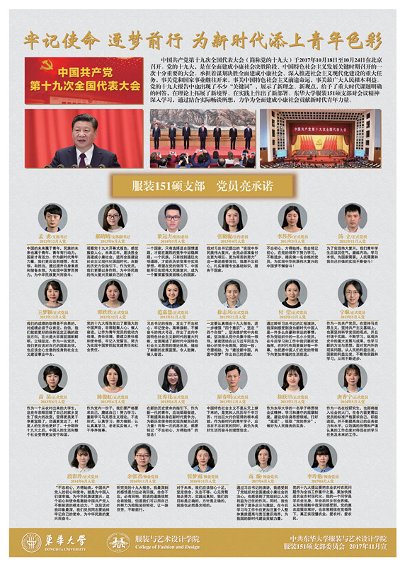 服装151硕党支部学习十九大活动是服装与艺术设计学院党委各支部学习宣传贯彻十九大精神热潮的一部分,学院党委还将进一步深入组织和开展好相关活动,通过结合学科特点、专业优势和发展实际,利用各种渠道,采取不同形式,认真组织各种学习宣传活动,推动学习宣传贯彻党的十九大精神不断走向深入。
