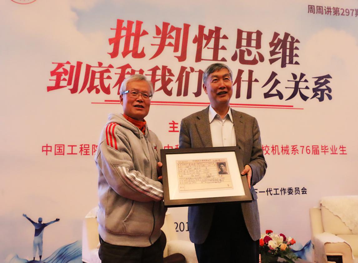 (校关工委副主任浦解明为李培根院士赠送学籍卡)