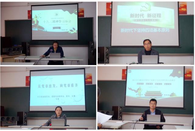 仝泽民紧扣党的十九大报告,围绕新时代,新历史,新理论,新方略,新征程,将十九大精神深入浅出地融入内容中;秦艳同志从党章的核心、根本、关键、实质出发,进一步讲解习近平新时代中国特色社会主义思想的特殊重大意义和丰富内涵;王军同志以学习宣传贯彻十九大精神体会、感想为重点,结合自身学习体会,针对如何“如何不忘初心、牢记使命跟党走”等进行重点学习讨论;赵敬德同志通过生动、鲜活的故事,阐释十九大精神、讲述新时代气象,展示作为一名专业教师学习宣传贯彻党的十九大精神取得的新成效。四位党员在“微党课”中围绕党的十九大精神,紧密结合工作实际,多角度切入,多方位展示,分享自己的学习体会。透彻深入的宣讲、鲜活生动的解读,赢得了阵阵热烈的掌声,引起了台下党员的强烈共鸣。会后,教工党员纷纷表示“这次的微党课有新意,受益匪浅,形式很新颖,牢牢抓住了大家的注意力;就像一个大讲堂,内容很生动,让我们对党的十九大精神的理解更加深入。”