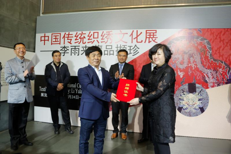 李雨来曾经多次向我校纺织服饰博物馆捐赠古代织绣品、织机。刘春红为李雨来颁发捐赠证书。