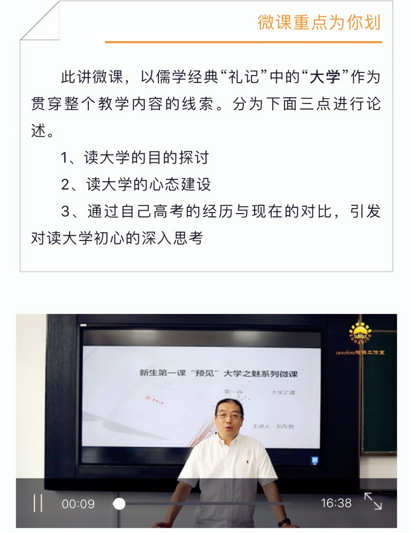 9月1日,第一讲《大学之道》播出不久,就有不少新生通过易班平台留言:“刘老师的微课掷地有声,让我更憧憬自己的大学生活了。”“利用午饭后的时间,学习了新生第一课,形式很新颖,内容也很实在,和以往想象中的大学课堂完全不一样,干货满满哒。”“很喜欢新生第一课,短小精致又让我浮想联翩,期待后面三讲……”