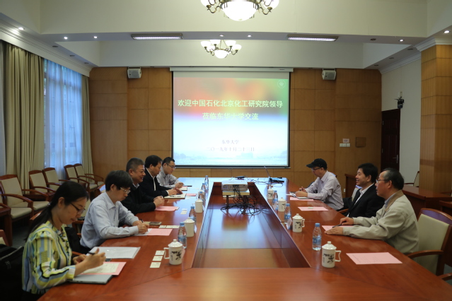 10月23日,中国石化北京化工研究院院长吴长江一行来校交流。校长俞建勇出席,中国石化北京化工研究院副院长王国清以及科研管理处、技术市场处相关负责同志,我校科技成果转化中心主任季诚昌等相关同志与会。