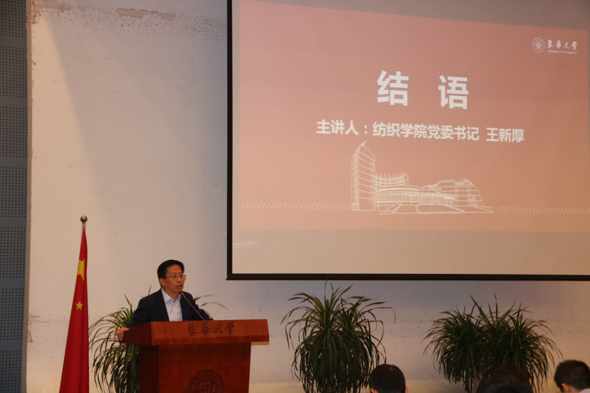 纺织学院党委书记王新厚总结时说,“不忘初心、牢记使命”已经成为新时代的最强音。初心的“初”从字体结构上便是由纺织而来,“衣被天下”就是纺织人的初心,为了人民更美好的生活踏踏实实奋斗。在教研工作、学习生活中,既要仰望天空,更要脚踏实地,扎扎实实学习,要用心学习党史、新中国史和新思想新理论,同时要努力增强学习本领。他希望广大师生牢记初心使命,矢志奋斗报国,为一流纺织学科和学院的发展努力写好“奋进之笔”。