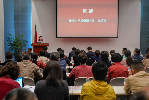 崔运花代表学校致辞,首先向参与论坛的联盟成员单位和校内外嘉宾表示热烈欢迎,并介绍了学校基本情况和侨务工作特色。她讲到,在学校建设发展中,党委高度重视为侨服务工作,侨联作为学校统一战线的一张名片,围绕侨“联”人才、侨“助”人才,注重区校联动,搭建了“侨青论坛”、“智力援疆”等品牌活动载体,组织归国留学青年骨干培训和开展“不忘初心、同圆梦想”等主题教育,激励学校侨界人士勇担新使命、实现新作为,陆续涌现出全国归侨侨眷先进个人、中国侨界贡献奖等先进个人,获得上海市侨联系统先进组织奖等多项集荣誉。她指出,学校侨联第五届侨青论坛的开放是将高校特色资源“破墙”、实现对外开放共享的一次创新实践,未来松江区大学城新侨联盟建设要坚持开放共享,持续打造对外开放新高地,促进高校互利共赢;要建立互通机制,推进区校联动发展,为长三角一体化国家战略推进作出新贡献;要创新载体,深化“地方侨联+高校侨联+校友会”联动机制,不断增强侨联组织的吸引力、凝聚力和影响力,深入开发海外校友资源,助力新侨与学校、经济社会共同发展。