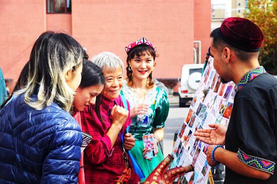 本次民族文化节还设置了民族特色展区,琳琅满目的民族风小物件、美轮美奂的民族服装、同学们亲手绘制的展板等从衣食住行多角度生动而细致地阐释少数民族文化。每个展台都有民族学生负责解说,互动性高,趣味性强,让大家真实感受到民族传统文化的瑰宝与魅力,激起了各民族同学继承、传播、发展民族文化的强烈兴趣。