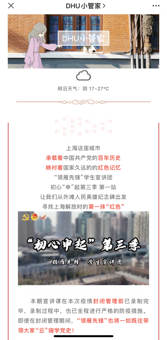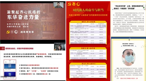 各学院也纷纷推出思政教育“云端”盛宴,多维联动保证思政教育不间断。纺织学院利用“红色经纬”等线上平台,开展主题留言征集,激发学生坚定战胜疫情的信心和决心。旭日工商管理学院“领雁先锋”学生宣讲团坚持在疫情“大考”中巩固党史学习教育,推出“战疫”红色微课,实现“云”端宣讲不断线。信息科学与技术学院撰写“予我一袋‘春光’,迎接全世界最温暖的春天”辅导员战“疫”手记,用暖心文字激发同心战“疫”的勇气与信念。计算机科学与技术学院组织“最美笔记大赛”,积极淬炼学生“专业见真章”的过硬本领,营造潜心学习的良好氛围。化学化工与生物工程学院录制“疫情防控,花生仁”加油微视频,引领学生边言边行边悟,从抗战“疫”“被感动”到“见行动”。材料科学与工程学院开展“博导云讲堂”,邀请博导班主任围绕“疫情下自我学习生活管理”等主题与学生进行“云”对话,帮助学生保持良好学习状态。环境科学与工程学院持续推进“学业陪伴计划”,筹备“线上学习加油包”,用“网课秘籍”,帮助学生提升学习效率。人文学院开展“云端互助学”活动,打造“云端学习菜单”,助力学生高效学习,做到“线上开课堂,学习不打烊”。理学院推出《致学院全体学生的疫情防控倡议书》,引导学生增强大局意识,与校、院同心同行。外语学院推出战“疫”心理知识小课堂,分享线上学习心理锦囊、“四有”心理调适妙招等干货,守护青年学生心理健康。丰富多彩的思政教育“大餐”让学生收获“时间表”,提升“获得感”。