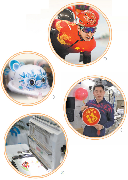 图①为短道速滑运动员武大靖比赛时身着国潮服饰;图②为2022年北京冬奥会开幕式各代表团引导员佩戴的虎头帽;图③为神舟十三号航天员叶光富在遥远的太空发来视频,向祖国和人民送上新春祝福(视频截图);图④为2021中国南通国际高端纺织产业博览会上展示的自动刺绣机器。 资料图片 制图:赵偲汝 |