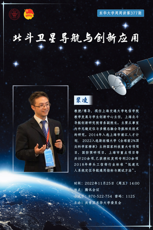 讲座简介:北斗卫星导航系统关乎国家安全和经济发展核心利益,是我国参与全球科技竞争的重大战略方向。报告将通过五个故事主题,讲述北斗卫星导航的定位原理和创新应用。主要讲座提纲:(1)地图上每一根线都是一场冒险;(2)虎门大桥上奔涌的后浪;(3)Contact-tracking:疫情中的隐私与生命之争;(4)没有卫星的一天;(5)如何赢得一场没有卫星的战争。