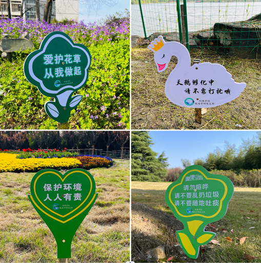 在活动筹办期间,支部党员通过实地考察提前了解了学校环保提示牌的情况,最终经过集体讨论,决定在学校花草较多及学生活动频繁的4个区域进行插牌,并一同设计了提示牌的样式及标语,包括“爱护花草,从我做起”“小心迈步,花草需要您的呵护”“保护环境,人人有责”“请勿喧哗,请不要乱扔垃圾,请不要随地吐痰”“天鹅孵化中,请不要打扰哦”等5种提示牌。为了提高活动当天插牌的完成度,支部特地提前联系到研究绿化的徐峰老师,拍摄了提示牌安插视频供大家学习。